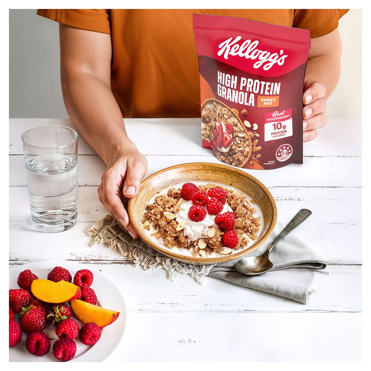 Whether it’s a quick breakfast with milk, a mid-morning snack with yoghurt, or a nourishing bowl topped with your favourite fruits and nuts, Kellogg's® High Protein Granola Honey Nut delivers real nourishment. It's a delicious way to own your morning.