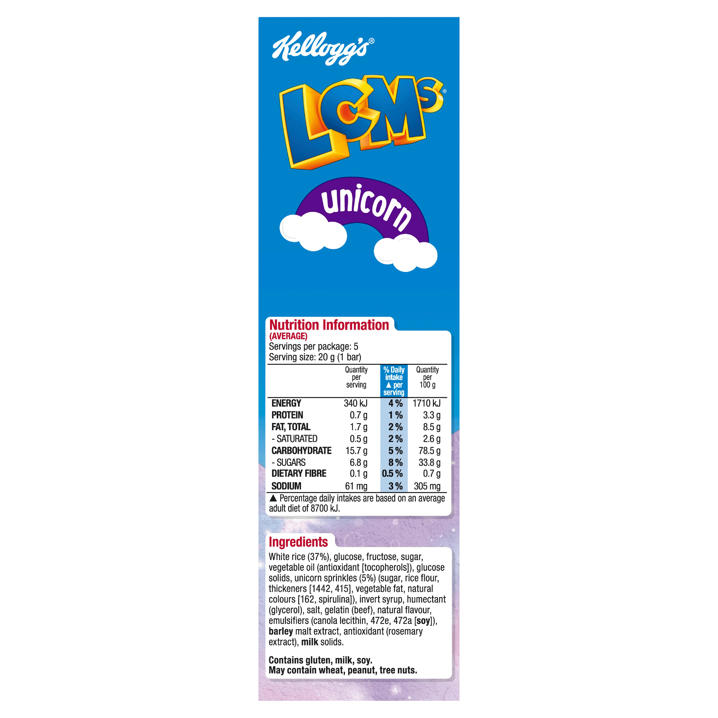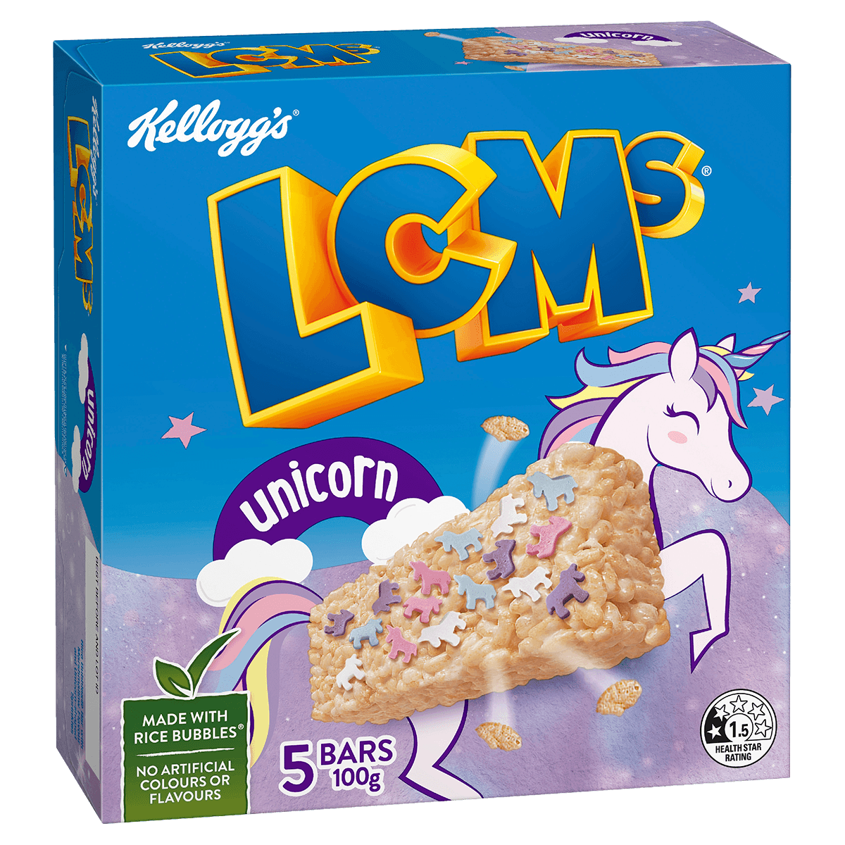 Bringing the magic of unicorns to your kid’s favourite LCMs bar! These Rice Bubbles® bars with marshmallow flavour and unicorn-shaped sprinkles have no artificial colours or flavours and are a tasty fun snack!